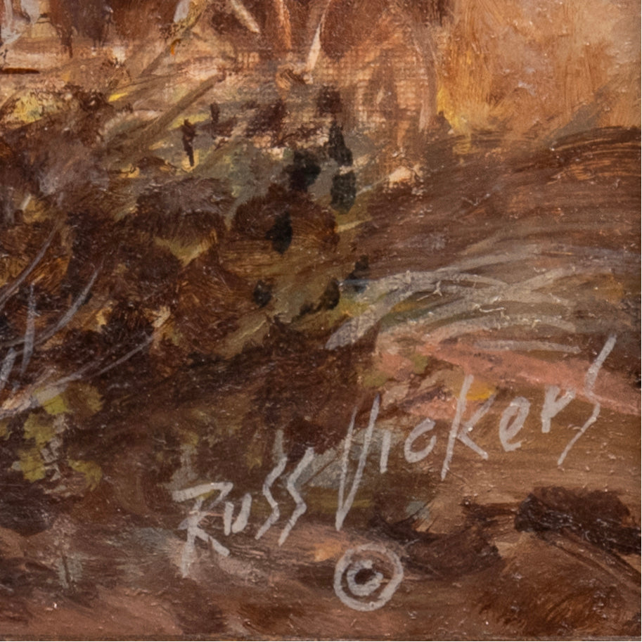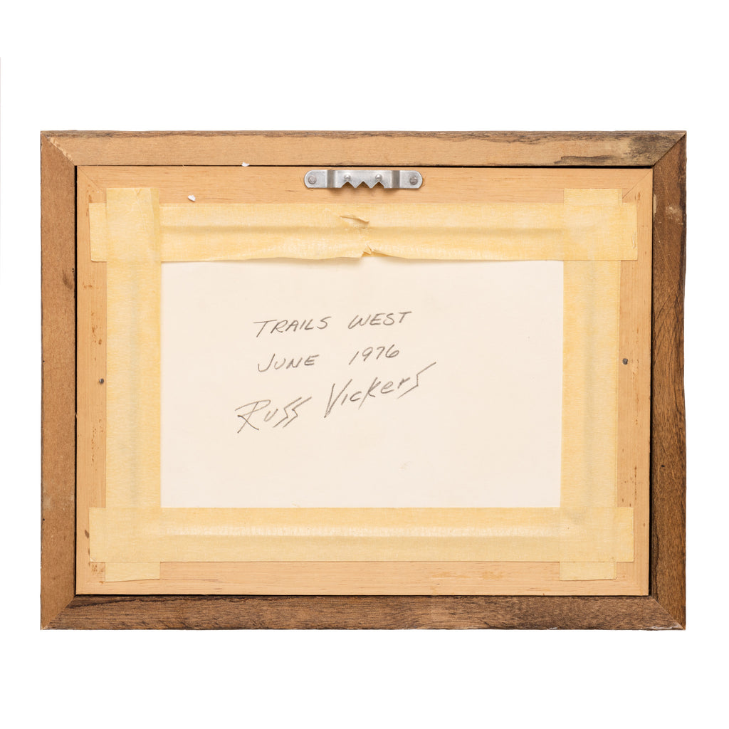 (1923 - 1997) Oil on canvas; 4" x 6". Hand signed lower right. 1976. Russ Vickers was noted as the artist for paintings shown at the beginning and ending credits of the movie, CHISUM, starring John Wayne. There is one painting in particular that begins the movie ... a lone horseman staring off into the land while under a sparse shady tree ... which then switches to the film's first frame and same shot of John Wayne's character looking out towards his land. Russ Vickers was a painter in realist or traditional style of western scenes, beginning with the Civil War and moving forward. He was born in Paris, Texas, and his father was a horse trader. He served in the Marines in World War II and as a combat artist in Korea. He had little formal schooling and spent about twenty years as a technical illustrator for the aerospace industry in Los Angeles, painting western genre in his spare time. In 1970, he took the correspondence course from the Famous Artists School and began showing his paintings in Sedona. From 1973, he lived in Tempe, Arizona and dedicated himself to full-time painting.