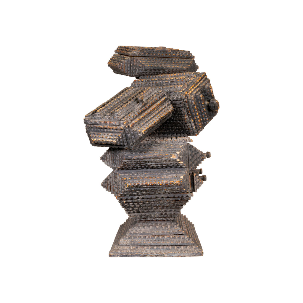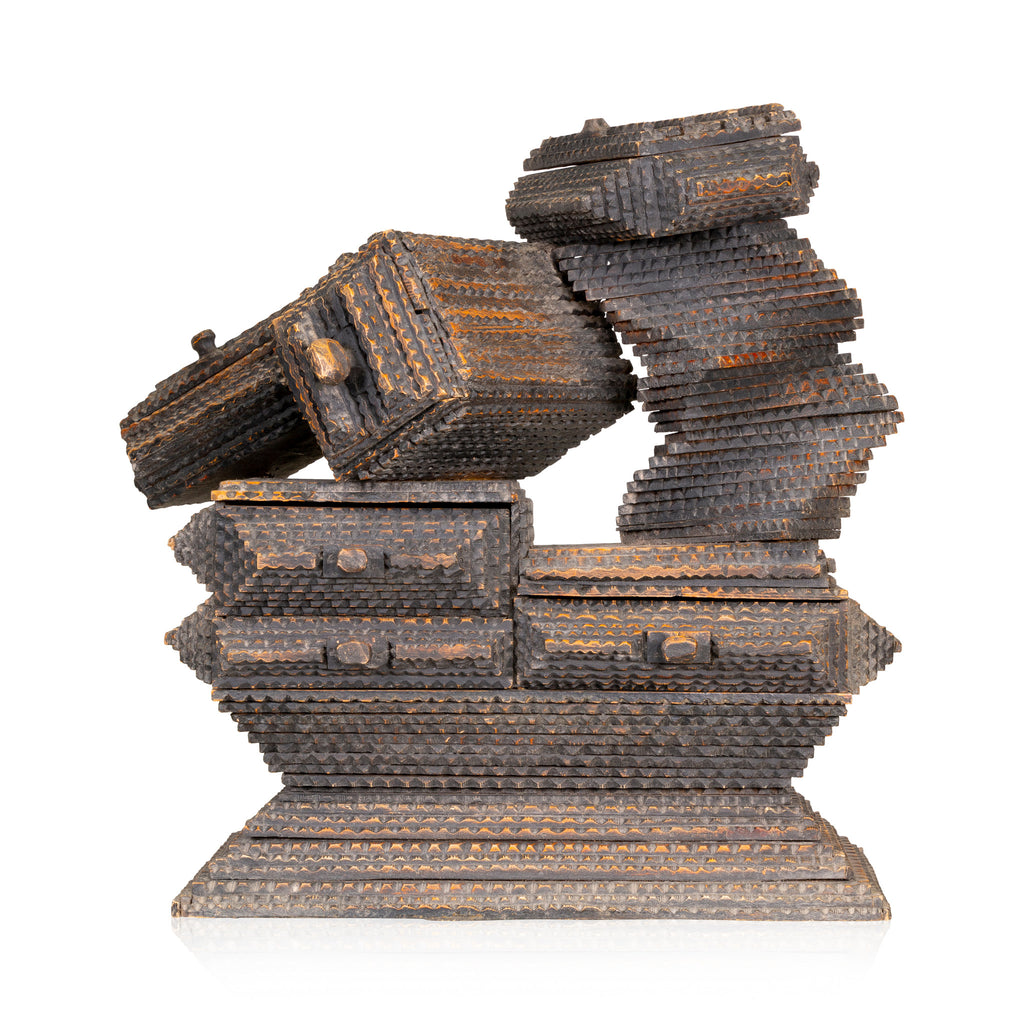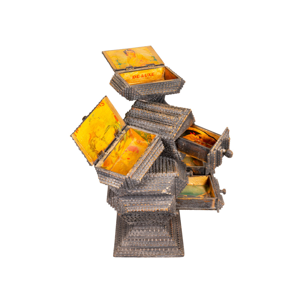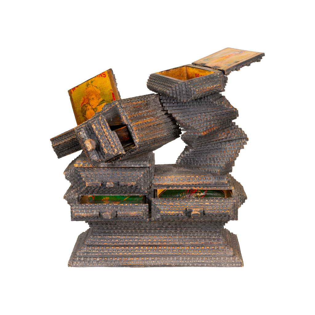 Folky tramp art piece by the Hermitage artists. Four drawers and two lidded boxes. All lined with cigar box liners.