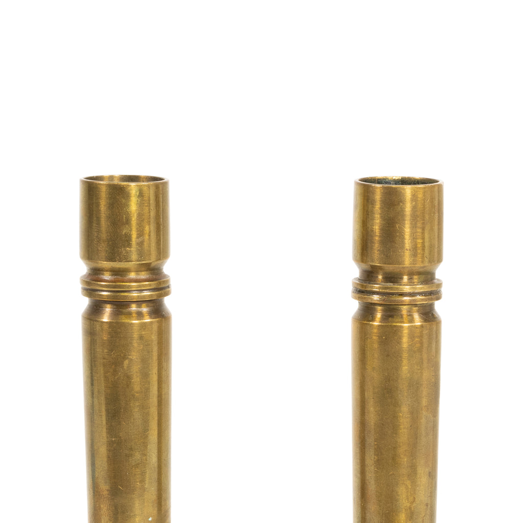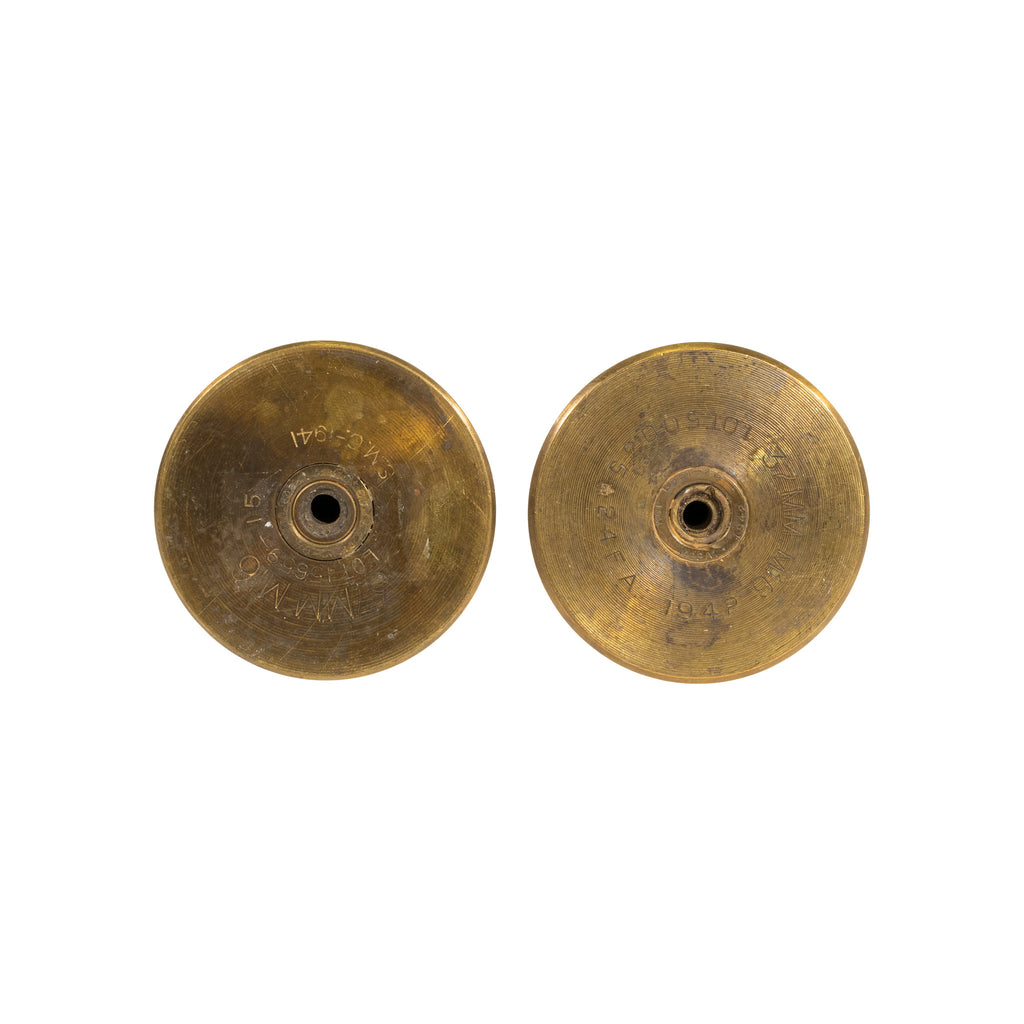 Pair of deco style WWII brass candle holders with wax catcher. Base is dated 1942.