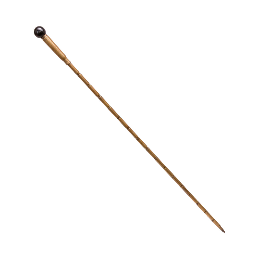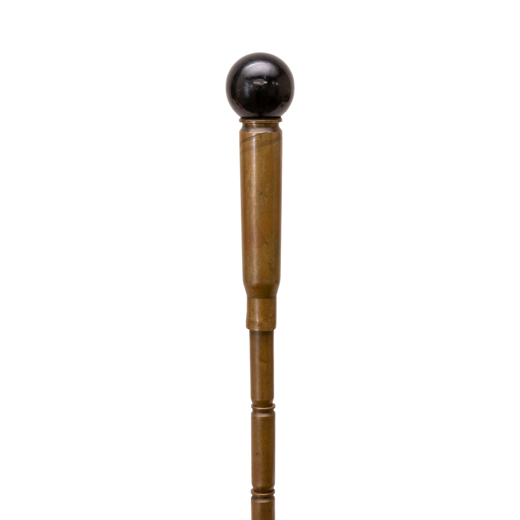 WWI Trench Art black ball horn handle cane with various brass shells which make up the shaft and a bullet ferrule, probably made in the trenches during WWI. A collector's piece. 1 1/4"H x 1 1/4" x 34 1/2" Overall