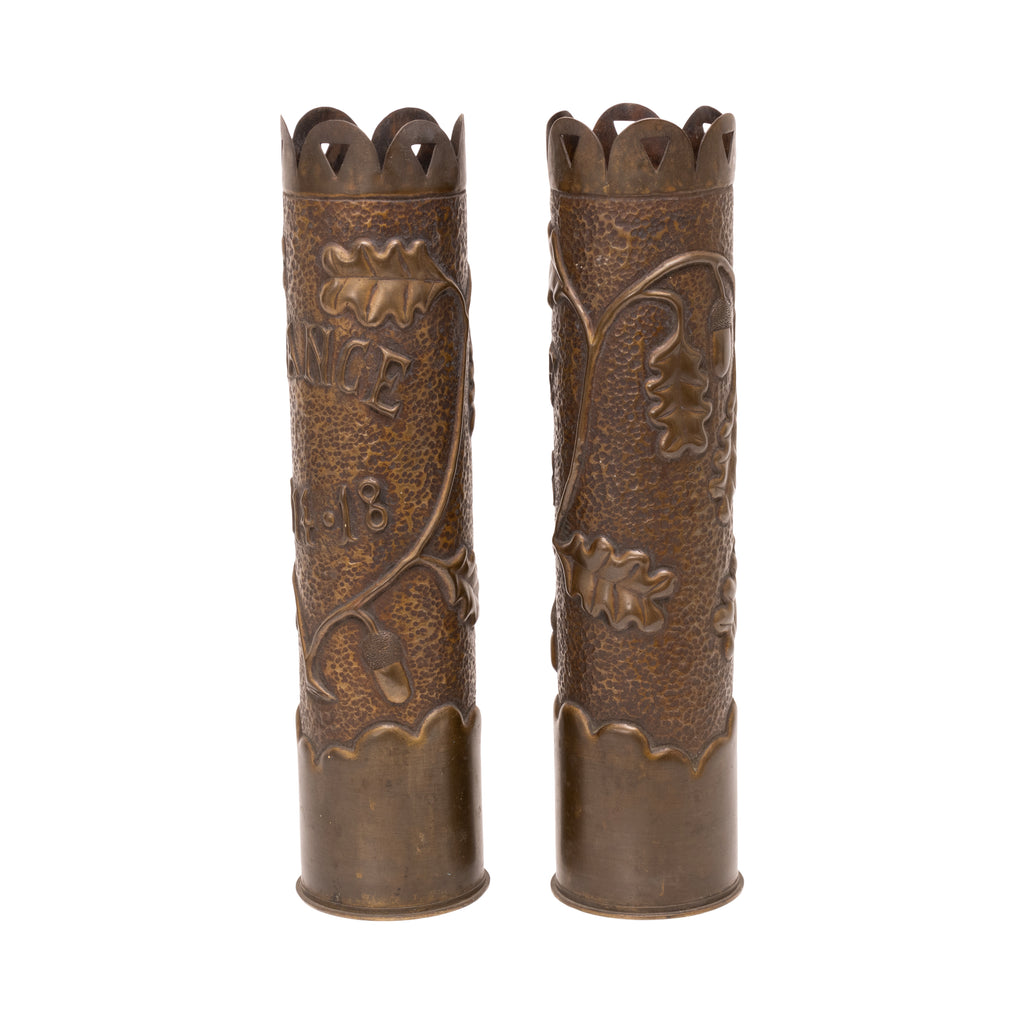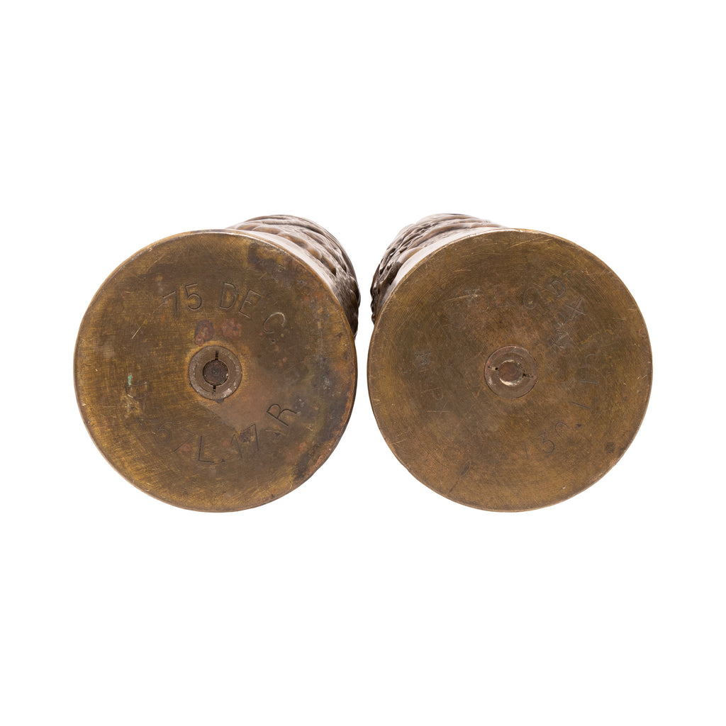 Trench Art pair with scallaoped top punctuated with triangles, oak leaf and acorn motif. Marked France 1914.18, shells marked 75DEC D267L.17.R. Base 3 1/4" x 13 1/2"H.