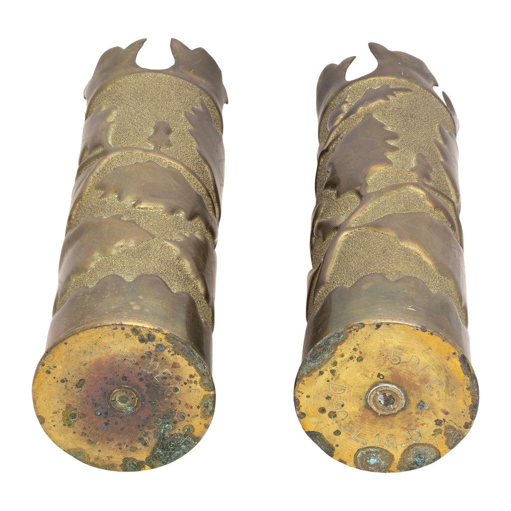 Pair of WWI era trench art vases fashioned from artillery shells. Crowned rim, raised foliate branches on textured ground. 12"H x 3 1/4"D