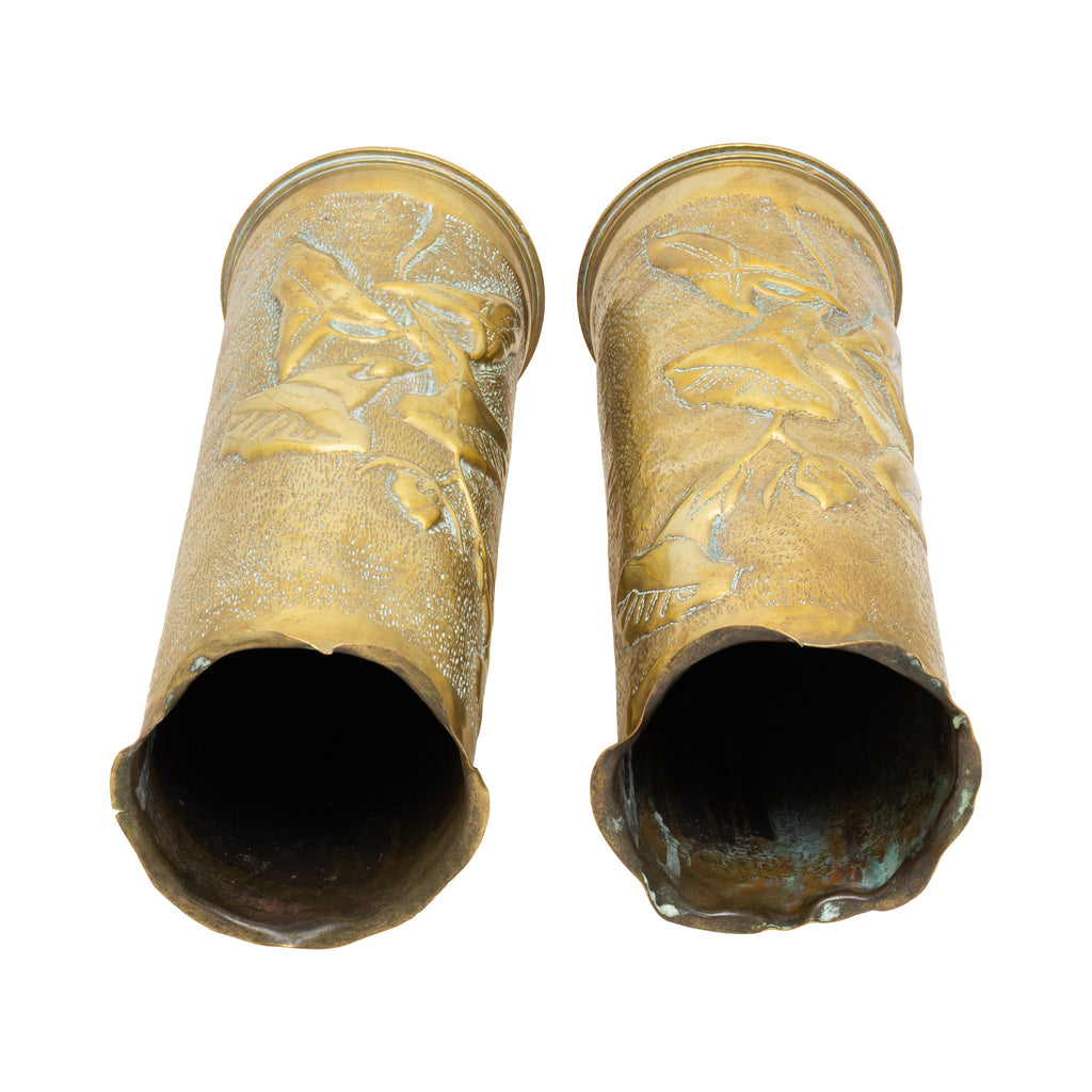 Pair of WWI era trench art vases fashioned from artillery shells. Flared rim over repousse floral motifs.