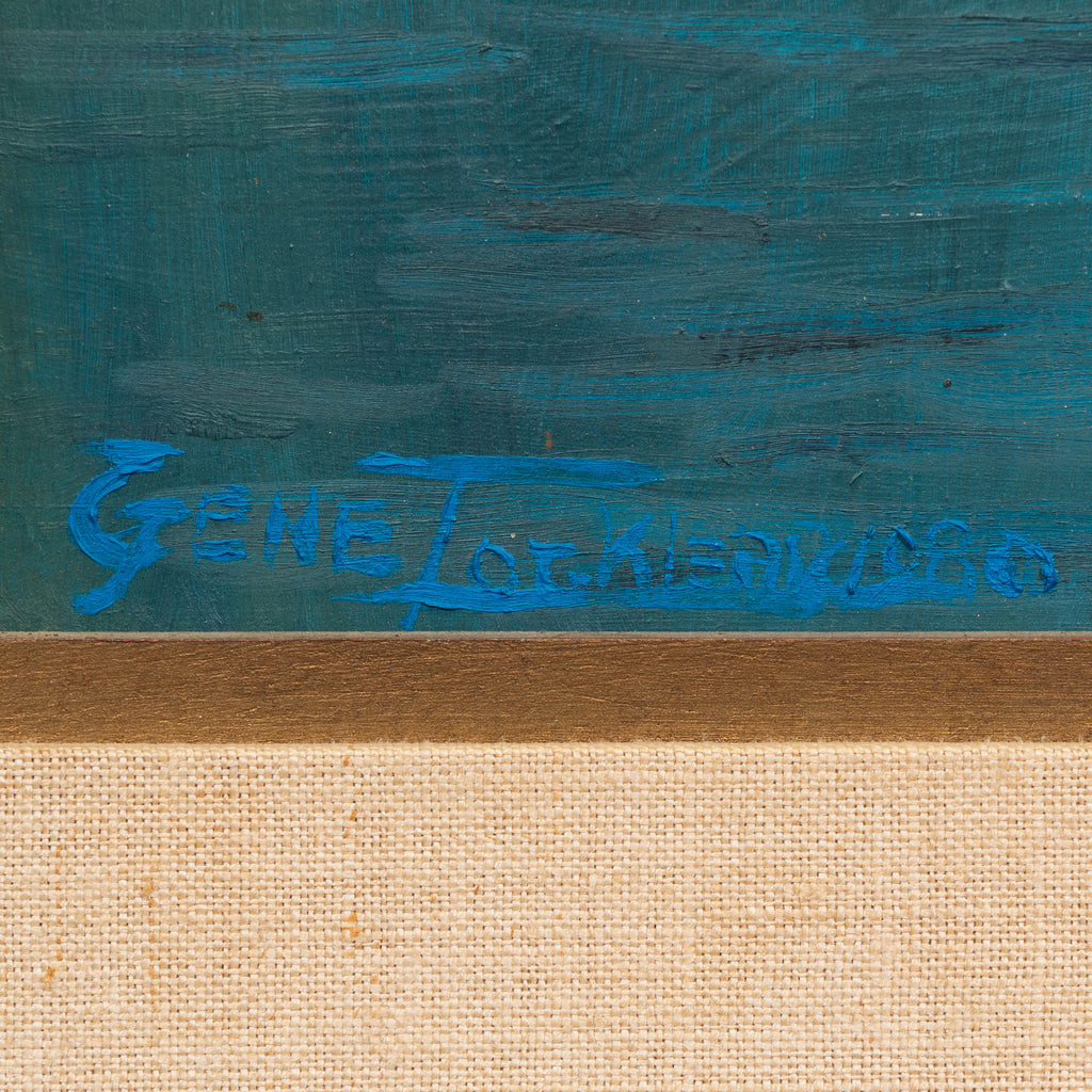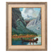 Oil on board; 22" x 28". Two Indians in a birch bark canoe with mountains and teepee village in background. Framed