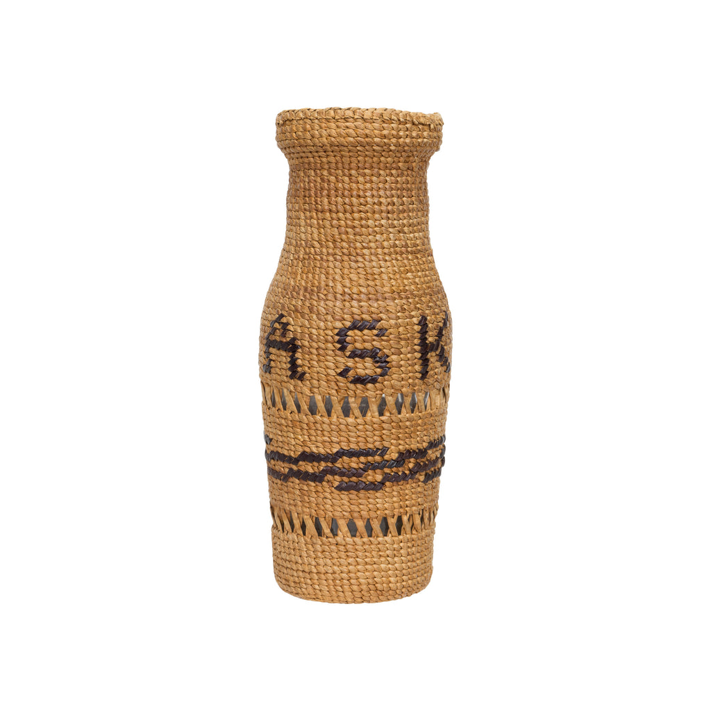 Tsimshian basketry bottle. Woven "Alaska". Some open weave. 5 1/2"H x 2"D