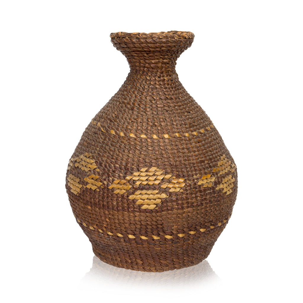 Tsimshian basketry bottle over Chinese porcelain liquor bottle. Early museum collection numbers 3.58.5. 7 1/4"H x 5 1/2"D