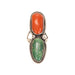 Cerillos turquoise and coral ring in classic twisted rope border. No maker's mark.