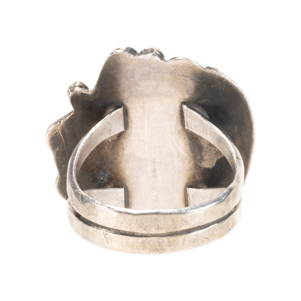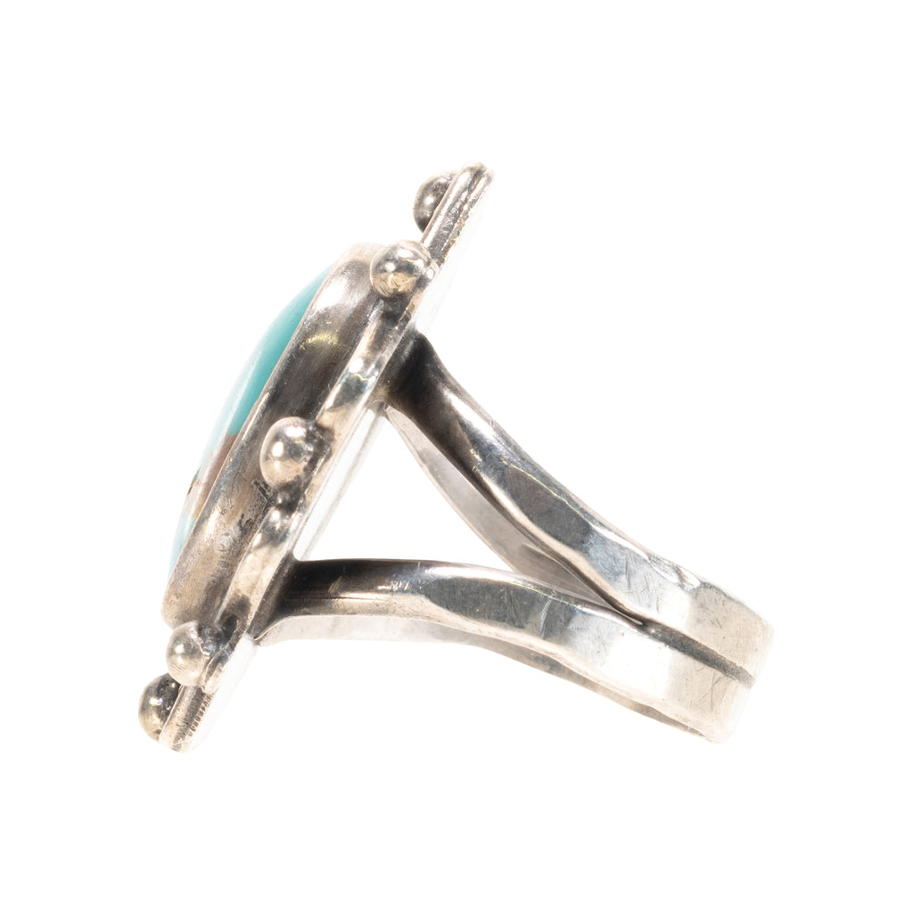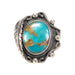 Royston turquoise and sterling ring in twisted rope and leaf design set in simple shadowbox.