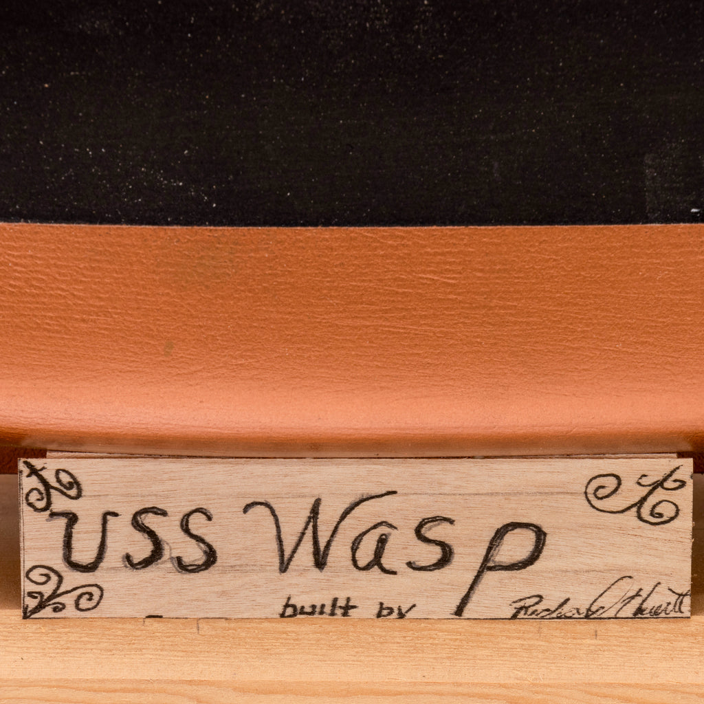 Wood model ship carving of the USS Wasp. 36"L x 8" x 28"H. Hand carved and detailed by Richard Hewitt. Richard Hewitt moved to Port Townsend, WA when he was 18 to take a job as a boat builder. He lived in Port Townsend for 27 years and raised his family there. He always had a passion for tall ships from the past and started building hand crafted wooden ship models when his family was young. He enjoyed building the forgotten ships – those with no photos or paintings, just a record in the archives. By reading the history, his artist eye started creating what he thought the ship may have looked like. Each ship is started with a solid block of wood, he carved the full by hand. To complete the ship, it takes anywhere from 8 to 12 months. Each ship is special and hard for him to part with, but his shipyard was getting full.