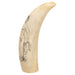 Victorian evocative scrimshawed sperm whale tooth of nude woman. Graceful and evocative example of traditional scrimshaw, this large polished sperm whale tooth features a finely incised depiction of a nude woman, rendered in the classic style of late Victorian to early Edwardian-era maritime folk art. The woman holds a draped garment at her side, her figure outlined in delicate inked strokes that suggest and artist's careful attention to proportion and gesture. 19th Century. 7"L x 1 1/2"D