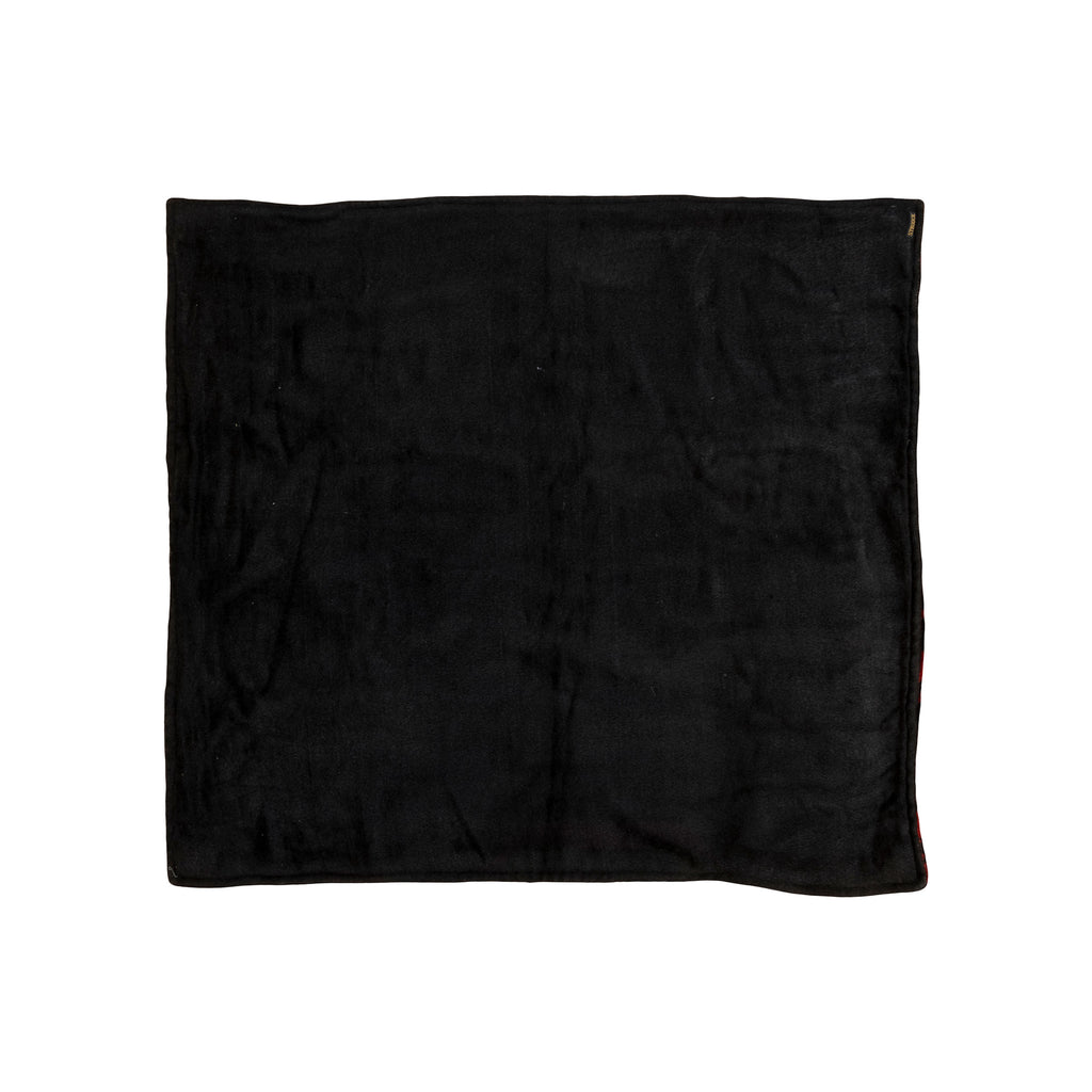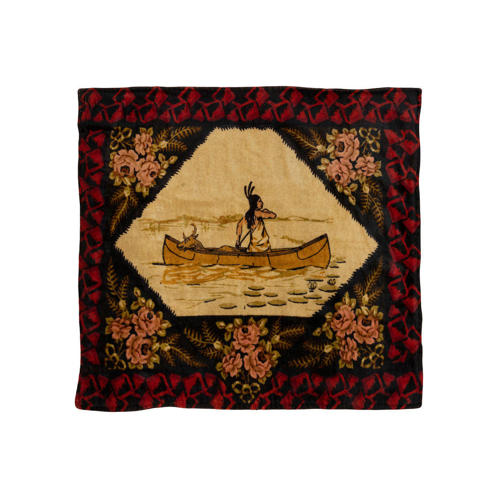 Vintage wool lap robe with Indian, canoe and buck surrounded by floral design having black and red edging.