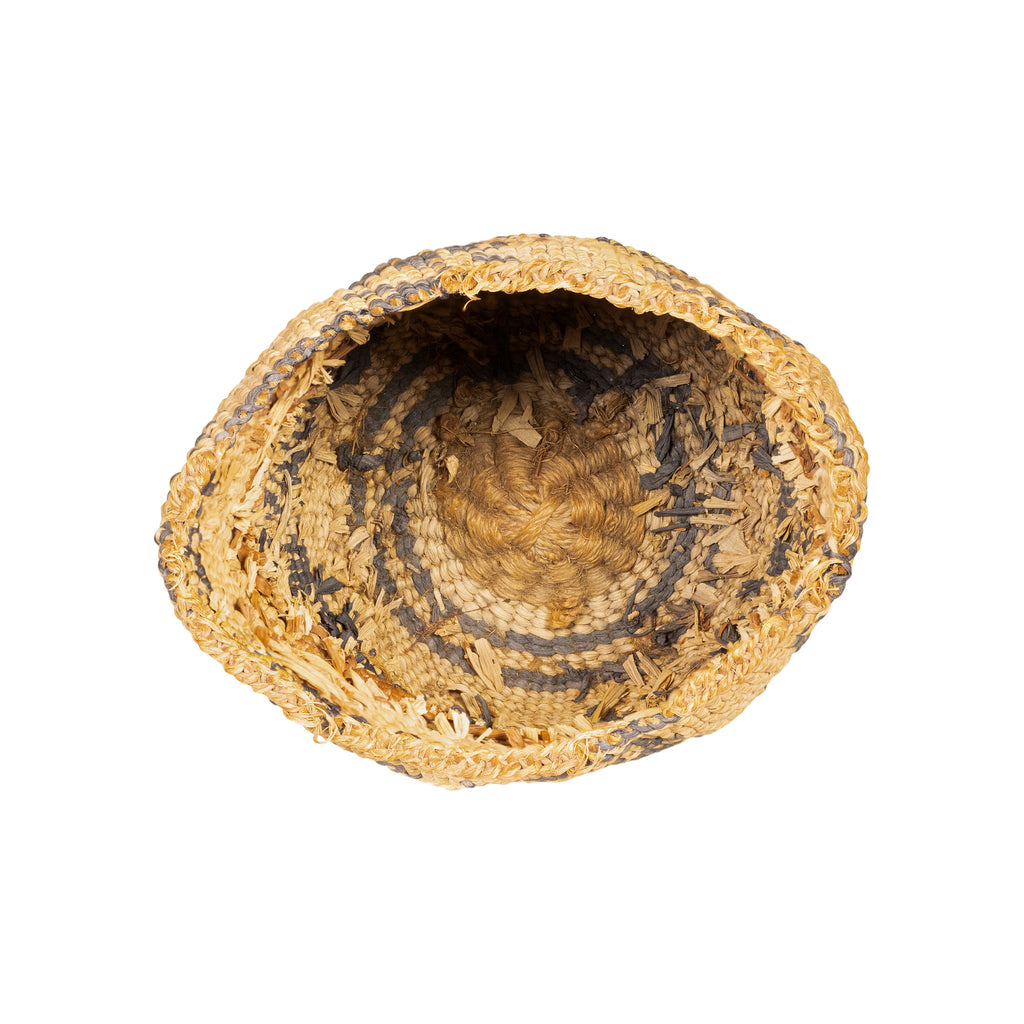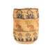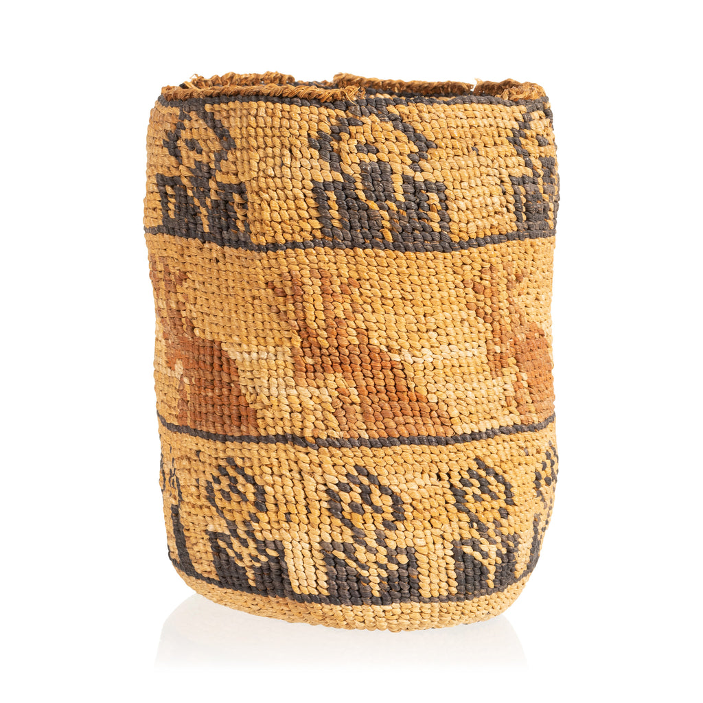 Wasco polychrome sally bag. Soft sided container woven with rows of men and women flanking a central band of elk or deer. 6" x4". Same maker as one that sold in Bonhams in 2008.