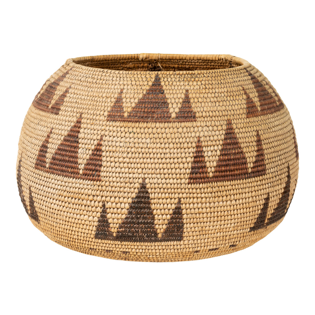 Washoe polychrome basket with triangle motif. Tightly woven.