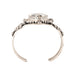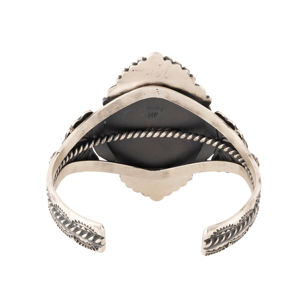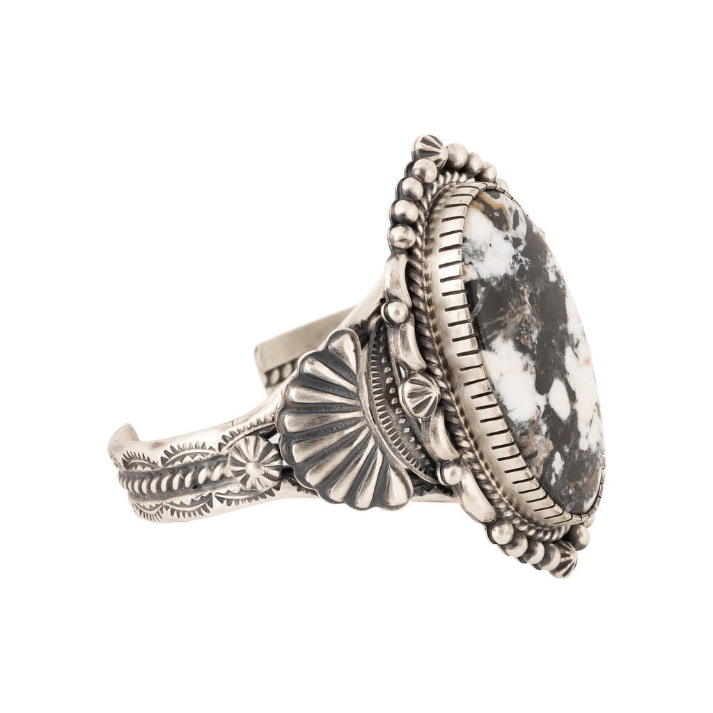 Navajo white buffalo turquoise bracelet set in sterling silver. Large center with cast and hand stamped palmettes and twisted rope border design. Very nice detail and solid weight. White Buffalo is often referred to as turquoise due to its discovery in a