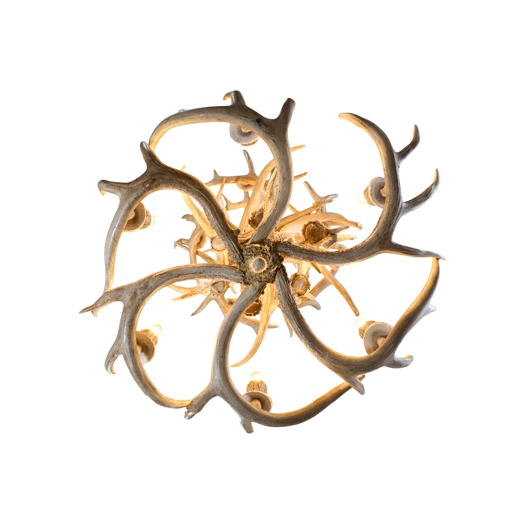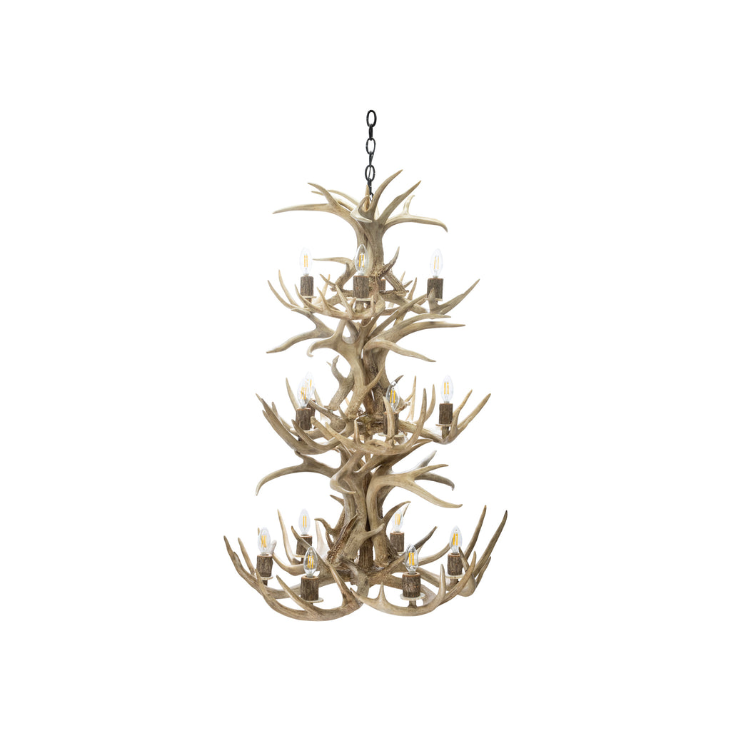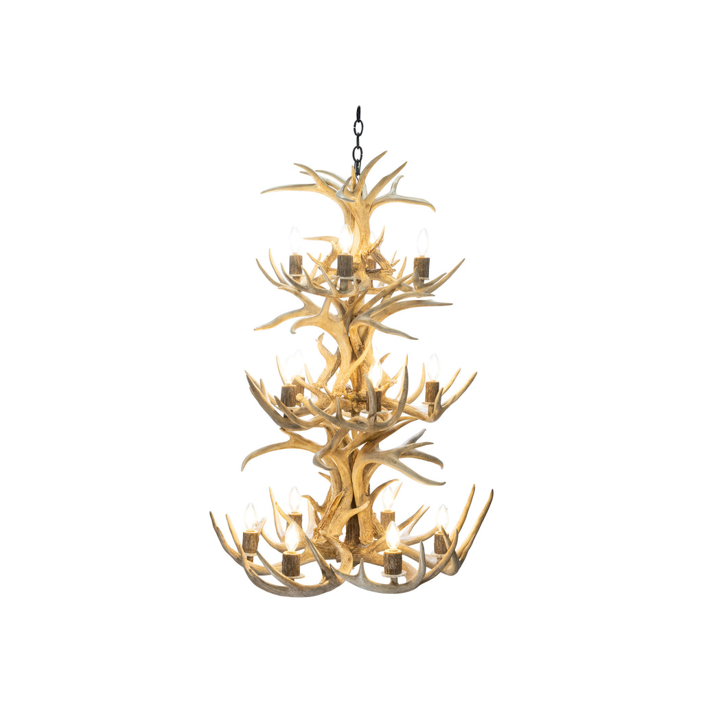 Massive three tier whitetail deer chandelier with natural antlers and 15 lights. Great craftsmanship and beautiful piece for any lodge, resort or rustic setting. Comes complete with chain and wired ready for hanging. Measures 42"H x 36"D