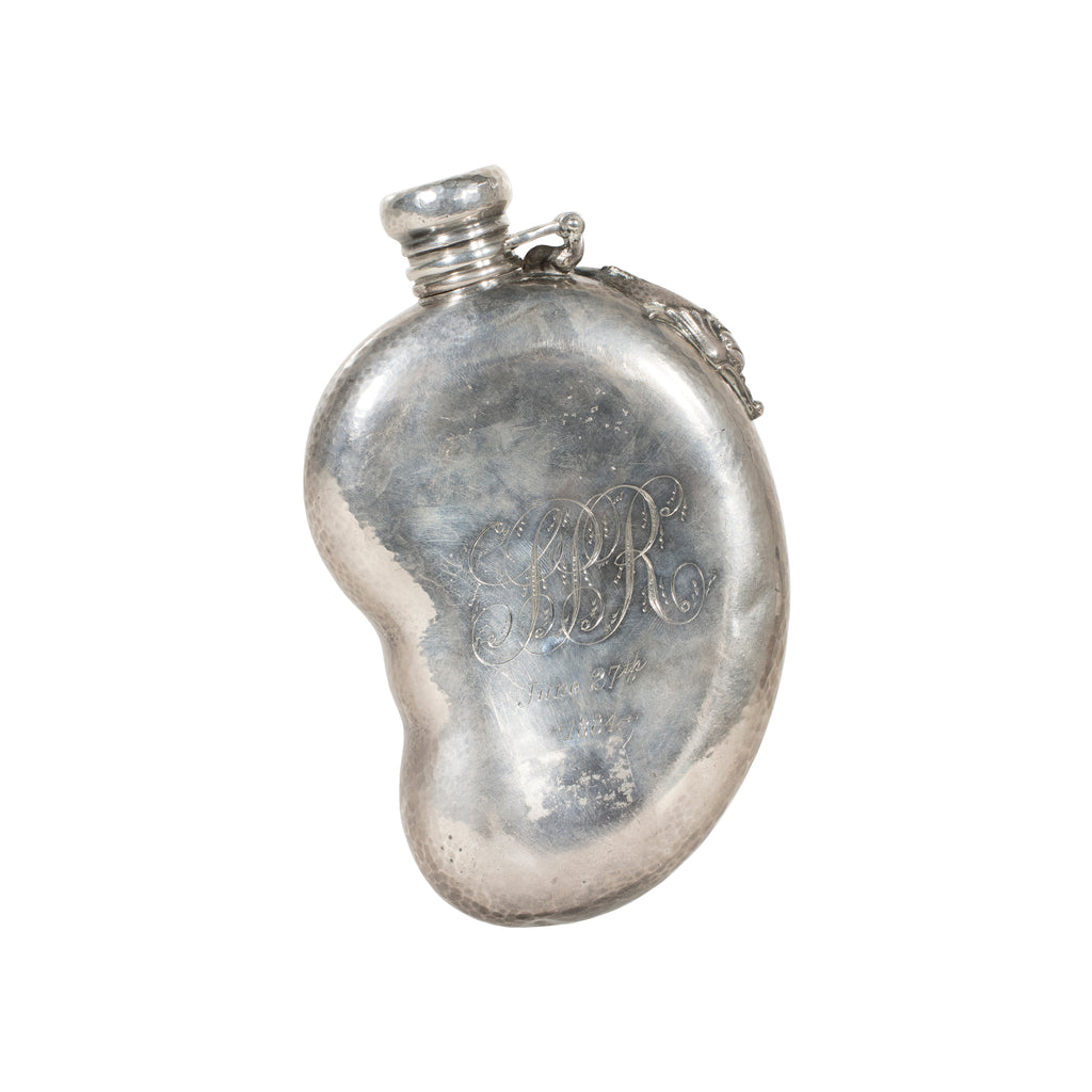 Whiting sterling silver flask. Woman in a wave on front, dolphin near hinge, monogrammed with date on back, and hammered on sides and cap. 6 1/4"