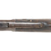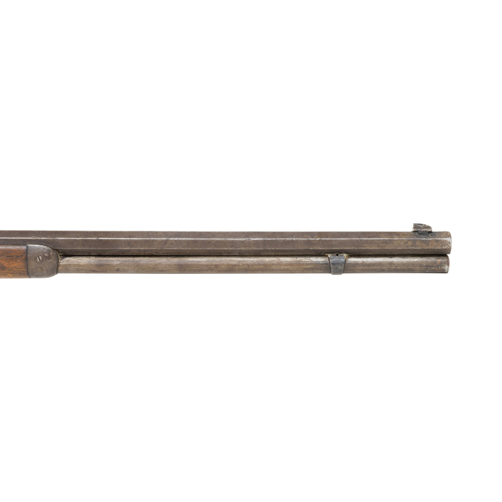 Winchester Model 1873 Native used rifle, .38 cal, octagon barrel, serial #168707A, manufactured 1876. 24" barrel. Hide wrapping on stock. Carved U on forearm. Dome square shanked brass tack decoration. Rear site removed for saddle sheath. A Native and much used piece. Ex. N.W. Indian Cultural Center Museum, Spokane. Obtained when the museum closed in the 1980's. 43 1/2" overall.