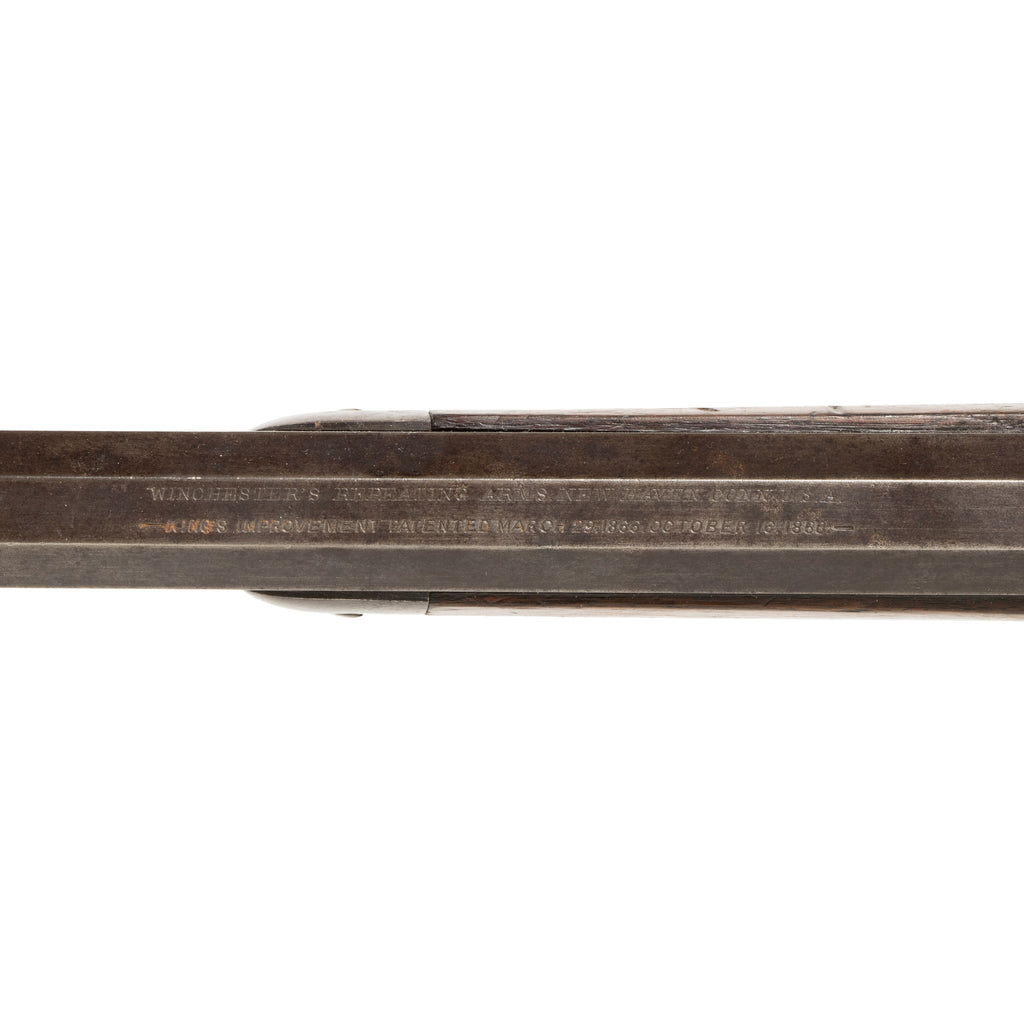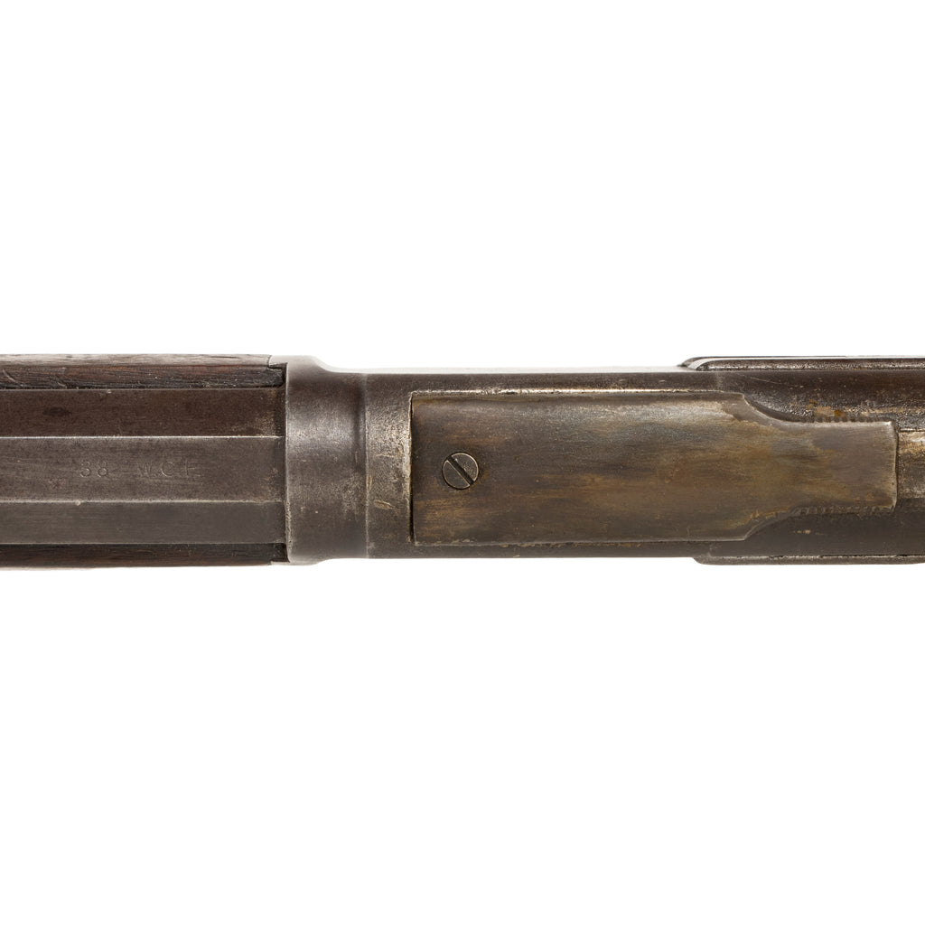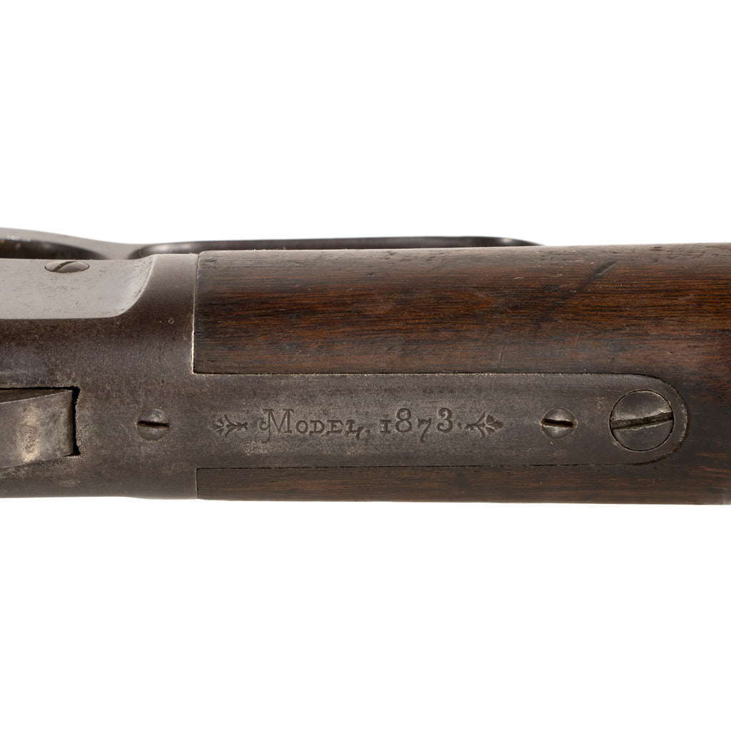 2nd model Winchester 1873 rifle. .38-40 caliber, 24" octagonal barrel, S/N 237274B (mfg. ca1887). Blued finish, smooth straight gripped walnut stock with crescent buttplate and smooth forearm. Standard markings, elevation adjustable buckhorn rear sight,