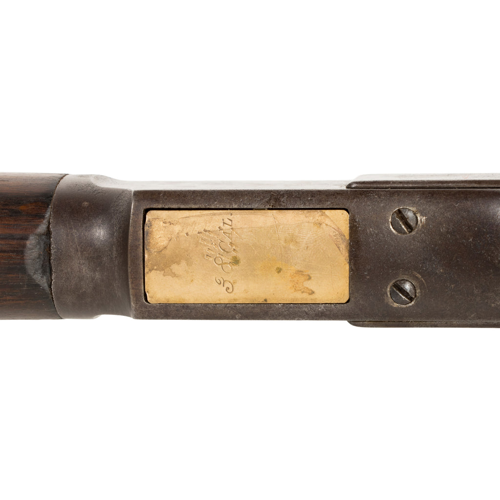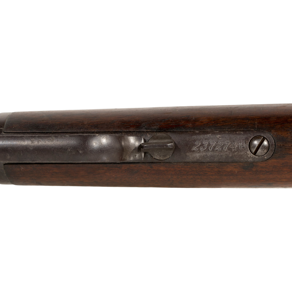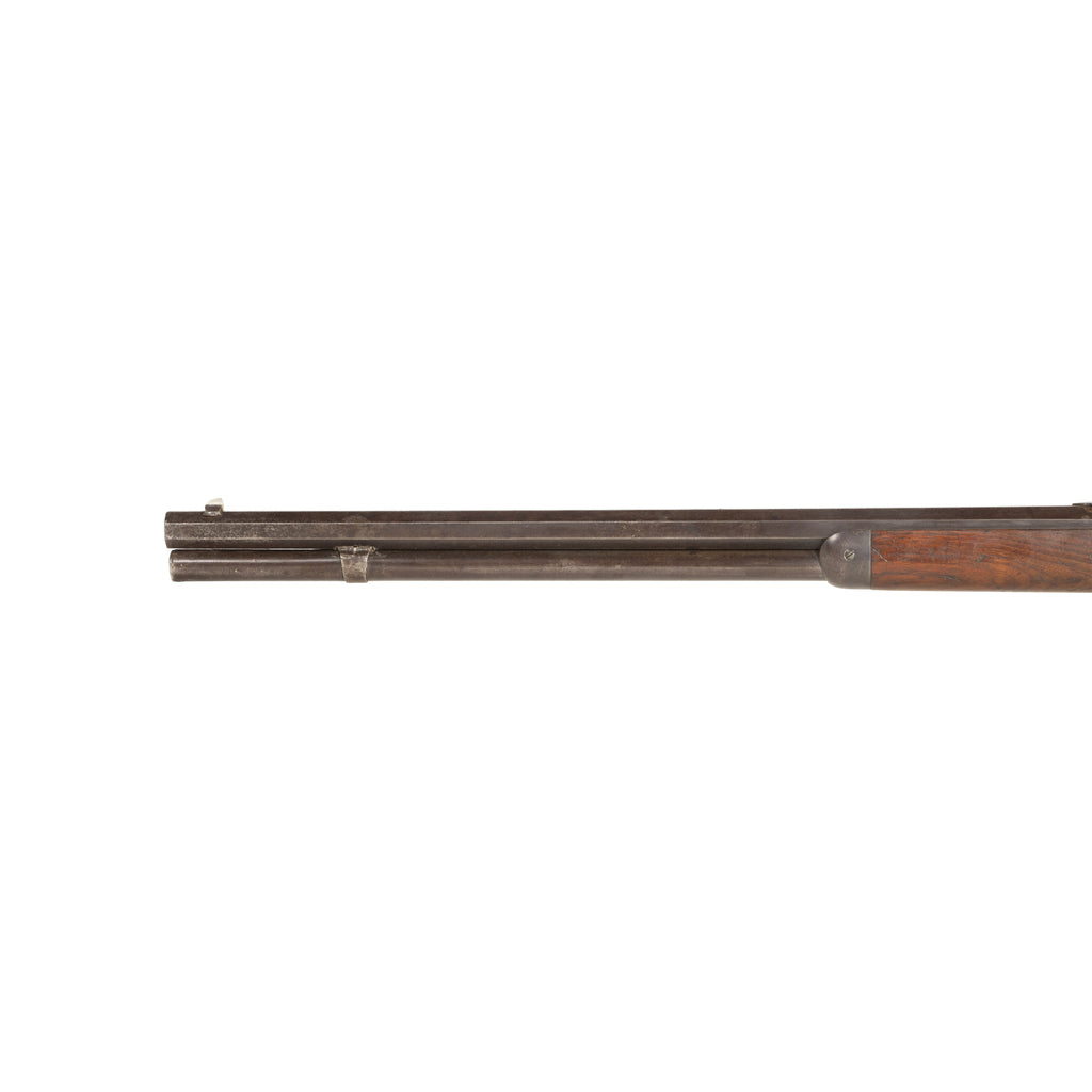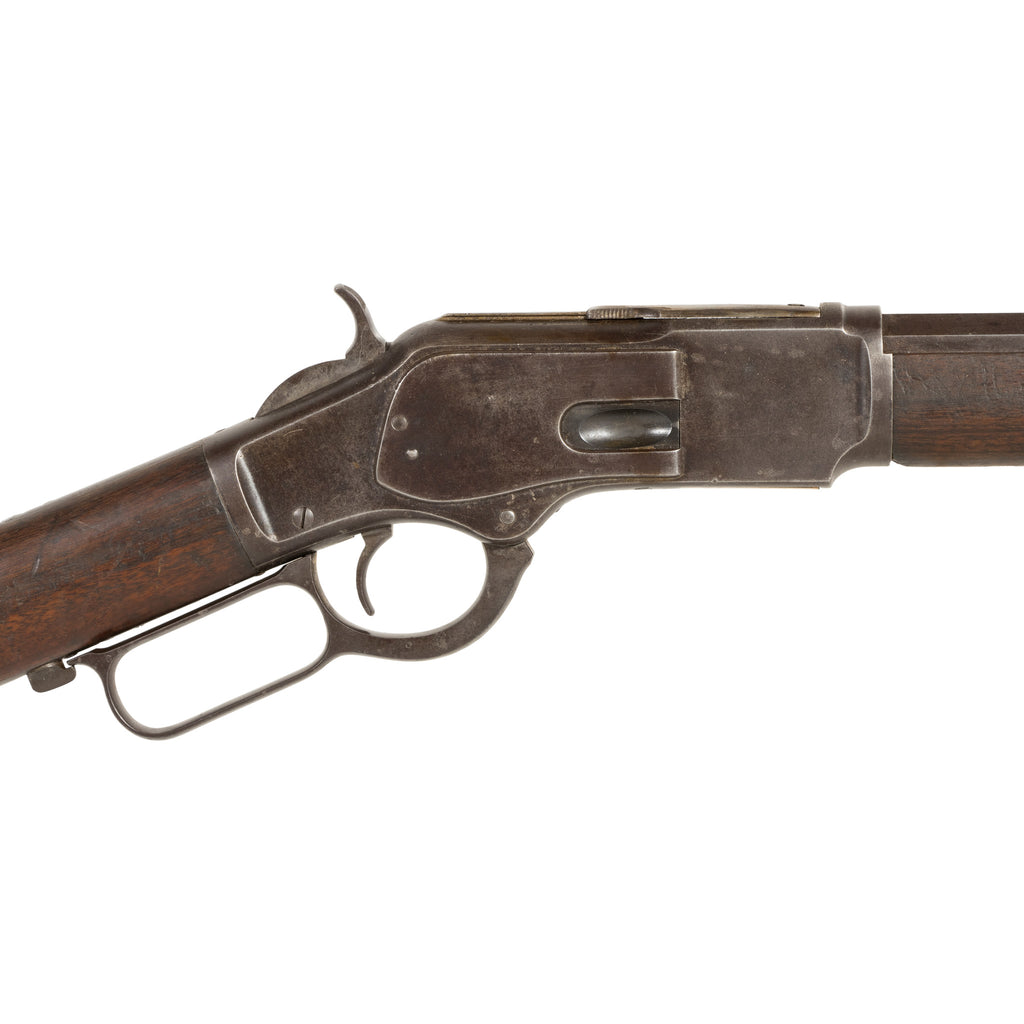 2nd model Winchester 1873 rifle. .38-40 caliber, 24" octagonal barrel, S/N 237274B (mfg. ca1887). Blued finish, smooth straight gripped walnut stock with crescent buttplate and smooth forearm. Standard markings, elevation adjustable buckhorn rear sight,