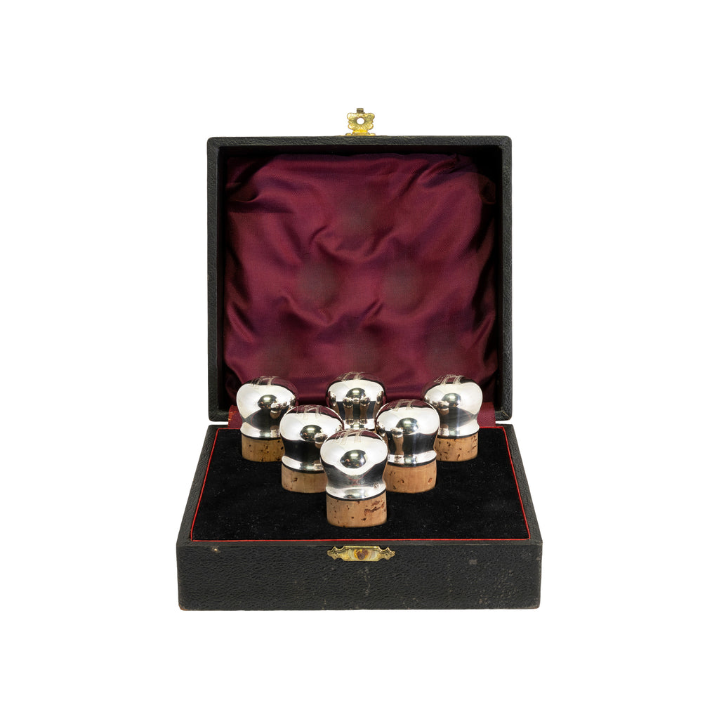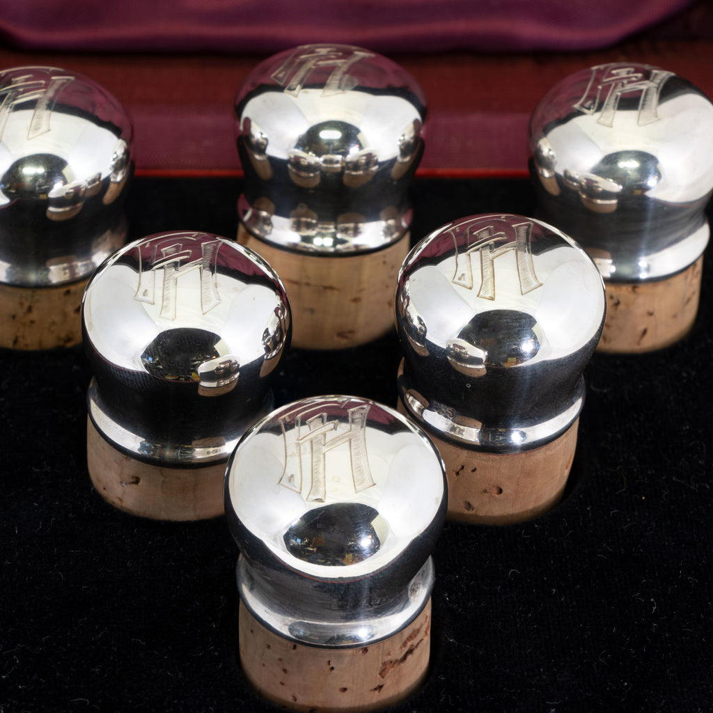 Continental set of six silver capped wine cork stoppers. Monogrammed "FH" of Fritz Haefele in presentation box. 835 silver. Provenance Haefele family of Stuttgar, Germany.