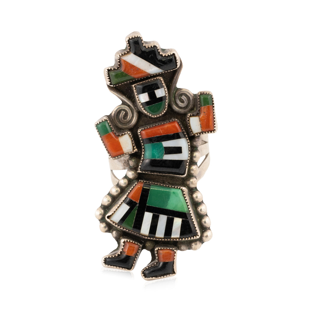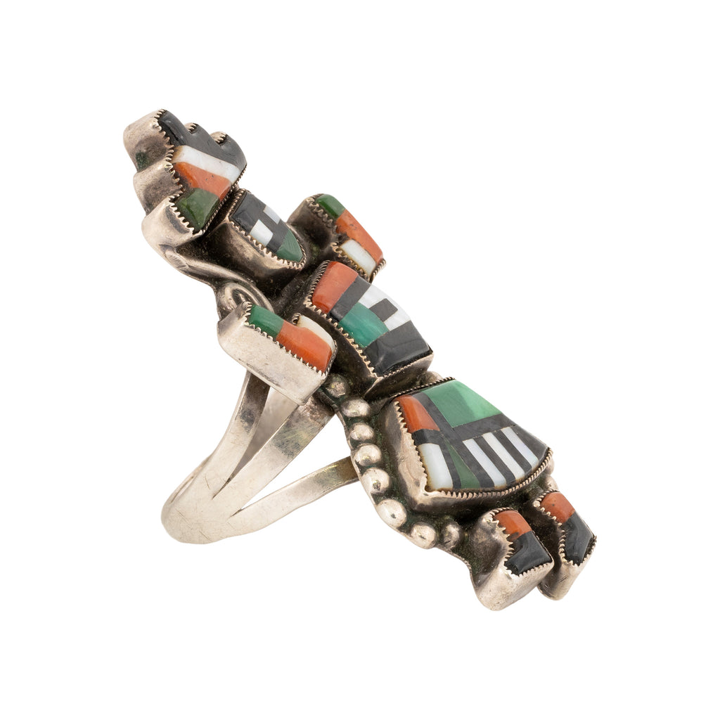 Zuni dancer ring with inlaid green turquoise, coral, onyx and mother of pearl with silver bead trim.