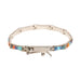 Zuni multi stone link bracelet with inlaid stones of turquoise, onyx, spiny oyster and lapis set in links of sterling silver. Maker maked by Don Lucas and stamped Sterling. Don launched his signature Heritage Collection of handmade and handcrafted jewelry, with aarth's rare gems and potent semi-precious stones, nearly 40 years ago. Don is committed to preserving the origins of our country's lost traditions, honoring America's Native and art-filled history. 8"L, 18.22 grams.