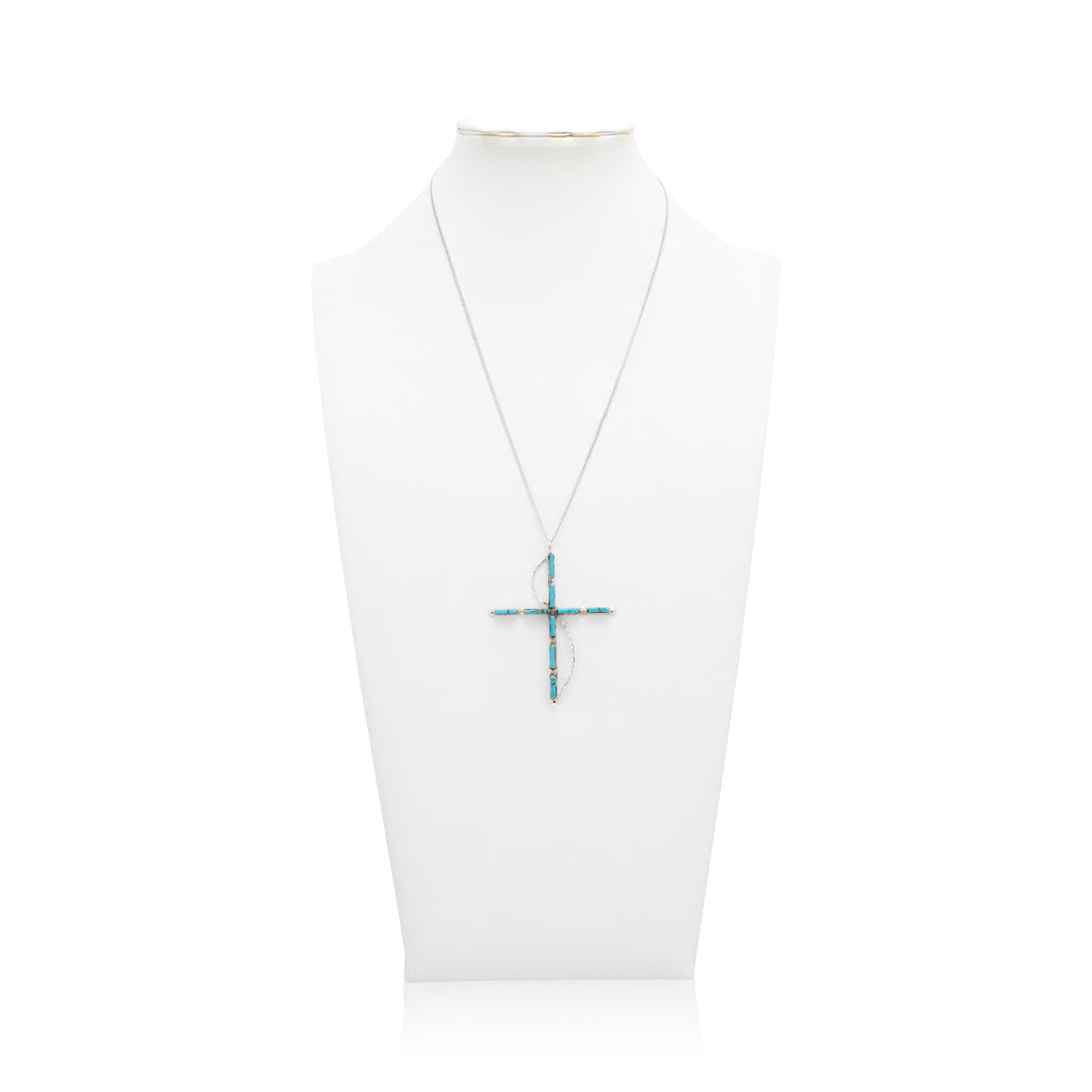 Zuni sterling silver and Sleeping Beauty turquoise cross pendant on a simple sterling silver chain. Natural untreated needlepoint stones in the figure of a cross on sterling background.