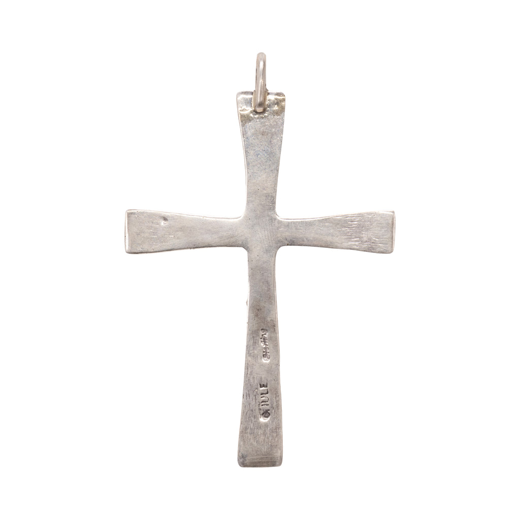 Zuni Sleeping Beauty turquoise and sterling silver cross by Zuni silversmith Cecilia Lule. Natural, untreated petit point stones in the form of a cross on sterling silver. Stamped "sterling" with makers mark on the back.